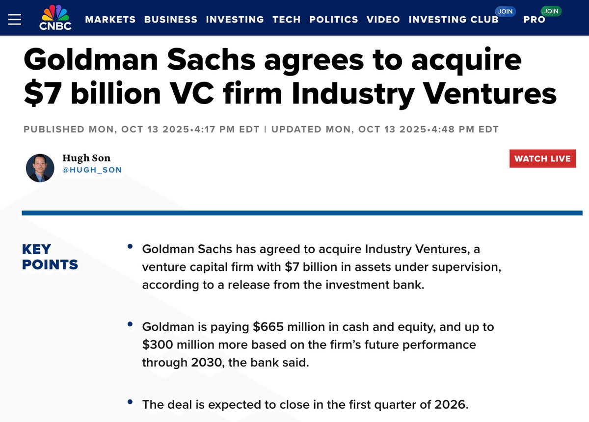先月、ゴールドマン・サックスがインダストリー・ベンチャーズ(Industry Ventures)を買収するというニュースが報じられました。この一文だけでも、今日のベンチャーキャピタル業界がどの方向に進んでいるのかが明確にわかります。ベンチャー投資は今や、より大きく、より制度化され、個人投資家にも容易にアクセスできる「商品」へと再編されつつあります。